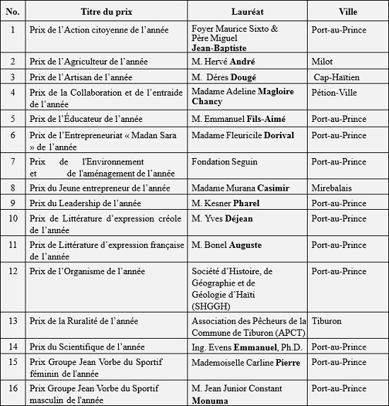 Jeudi, le Groupe de réflexion et d’Action pour une Haïti Nouvelle (GRAHN-Monde) a procédé à la remise de ses Prix d’excellence, édition 2013 au Karibé Convention Center. GRAHN-Monde a instauré en 2011 un programme de Prix d’excellence visant à reconnaître et à présenter en exemple des personnalités ou des organismes qui incarnent à l’échelle nationale les six principes suivants : justice sociale et participation citoyenne ; droit et accessibilité aux services de base ; continuité des actions positives ; arrimage avec le pays intérieur comme manifestation de la solidarité nationale ; urgence compatible avec le long terme et développement durable. Dans sa démarche, le GRAHN cherche à renforcer au pays, une culture d’excellence dans toutes les sphères d’activités, en insistant sur la réussite collective et le souci du bien commun. C’est donc une quête de progrès social par la valorisation et la stimulation des personnes qui incarnent le goût du travail bien fait, la persévérance à chercher un monde meilleur, le dépassement de soi et le sens de l’éthique. Ce programme de Prix d’excellence vise aussi à rendre hommage aux milliers d’anonymes de tous les coins du pays, qui travaillent dans l’ombre à améliorer la vie et entretenir l’espoir dans leur environnement immédiat et bien au-delà. Dans le cadre de la 2e édition du programme, le Jury International de Sélection 2013 a retenu 16 personnes et organismes d’exception. Liste des lauréats :