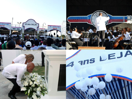 Hier 12 janvier 2014, le Président de la République, Michel Martelly, accompagné de la Première Dame, Mme Sophia Martelly, du Premier Ministre, M. Laurent Lamothe, le Président et le vice-Président de l’Assemblée Nationale ainsi que certains hauts dignitaires de l'Etat, du secteur religieux, de la société civile et du Corps diplomatique, ont commémoré dignement le 4ème anniversaire du séisme, cette journée de commémoration et de réflexion, selon l’Arrêté présidentiel du 8 Janvier 2014, s’est déroulée autour du thème « Célébrons la Vie, Regardons l'Avenir». Le Couple présidentiel s'est rendu, dans la matinée, sur le site de Saint-Christophe où il s'est recueilli et a déposé une gerbe de fleurs en mémoire des disparus. Au Palais présidentiel, une gerbe de fleurs a également été déposée en mémoire des 17 employés disparus ce jour là. Ces gestes de mémoire traduisent clairement une marque de respect pour les nombreux compatriotes qui nous ont quitté ce 12 janvier 2010. Cérémonie œcuménique, interprétations de chansons circonstancielles, moment de recueillement, sirène de la Police Nationale d’Haïti et lâché symbolique de ballons ont marqué également cette journée commémorative. Dans son message de circonstance rempli d’émotions au Champ de Mars, le Chef de l’Etat, qui a une pensée spéciale à l’endroit de toutes les victimes, a rappelé à la population haïtienne la nécessité de célébrer la vie, tout en projetant un nouveau regard sur le futur. « De même que vous aviez fait preuve d’unité et de solidarité au lendemain du séisme, vous devez vous unir pour continuer à avancer sur la voie du développement. C’est un devoir envers les victimes du 12 janvier », a déclaré le Président Martelly dont la volonté et l’engagement à poser des actions concrètes en vue de reconstruire le pays sont manifestes.