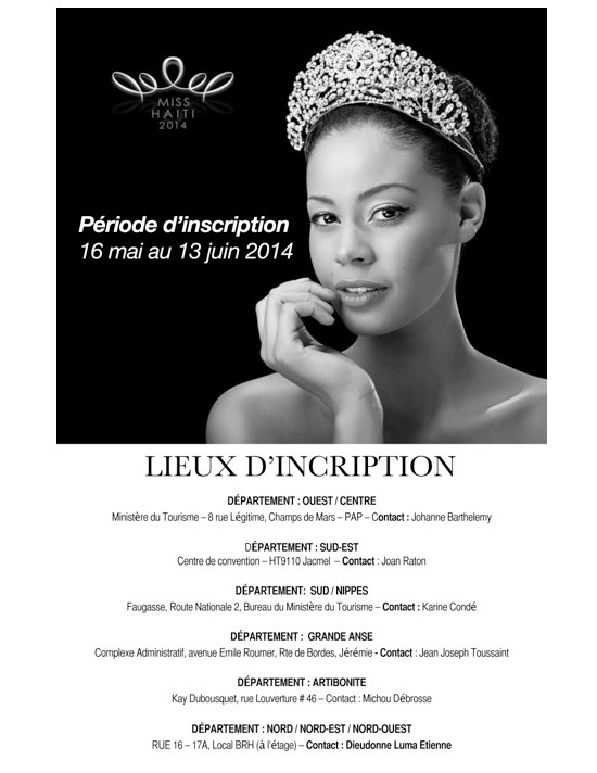 Les jeunes filles haïtiennes, des 10 départements et de la diaspora, qui souhaitent tenter leur chance pour devenir Miss Haïti 2014 (dans le respect des critères), ont jusqu’au 13 juin 2014 pour s’inscrire. Pour s’inscrire, les candidates doivent déposer leur document pour l’inscription dans l’une des 10 Directions Départementales du Tourisme ou envoyer leur candidature par internet, pour les candidates de la diaspora, afin d’être sélectionnées pour une aventure qui leur permettra, qui sait, de représenter Haïti à travers des concours de beauté internationaux prestigieux.
