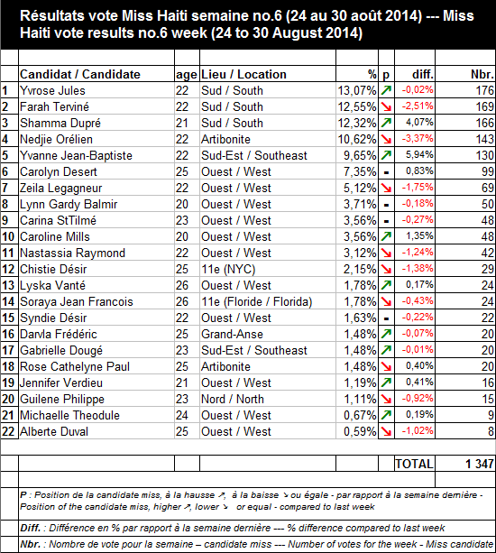 TOP 5 Classement Général Semaine # 6 (11,007 votes) : 1 - Nedjie Orélien (22 ans) Artibonite, 21.36% des votes (classement inchangé) 2 - Farah Terviné (22 ans) Sud, 17.05% des votes (classement inchangé) 3 - Zeila Legagneur (22 ans) Ouest, 7.23% des votes (classement inchangé) 4 - Carolyn Desert (25 ans) Ouest, 6.26% des votes (classement inchangé) 5 - Yvrose Jules (22 ans) Sud, 6.2% des votes (classement inchangé) Classement général final HaïtiLibre (22 candidates, % et nombre de voix) : https://www.haitilibre.com/vote-miss-haiti-2014-v2.php Le sondage HaïtiLibre est maintenant terminé, merci à tous nos lecteurs d’avoir encouragé avec passions par leurs commentaires nos Miss toutes plus belles les unes que les autres. Que la meilleurs gagne samedi 6 septembre, devant le grand Jury. Résultats semaine #5 : Résultats semaine #4 : Résultats semaine # 3 : Résultats semaine # 2 : Résultats semaine #1 : HL/ S/ HaïtiLibre