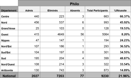 Suite aux examens du bac permanent, organisés du 18 décembre 2014 à l’intention des candidats recalés du baccalauréat 2ème partie (Philo), 2,027 candidats ont été admis au niveau national, sur un total de 9,230 participants, soit un taux de réussite de 21,96%, selon les informations communiquées par le Bureau National des Examens d’État (BUNEXE). Parmi les dix Directions Départementales de l’Éducation (DDE), le Centre obtient le meilleur taux de réussite avec 66,37 %, soit 440 candidats admis sur un total de 663 participants. Le Sud suit en deuxième position avec 48,87%, soit 195 admis sur 399 participants. Le Nord en troisième position avec 45,92 %, soit 456 candidats admis sur 993 participants. L’Ouest obtient le résultat le plus faible avec un taux de réussite de 8,20%, soit 415 admis sur 5,064 participants. Résultats pour les 10 départements :