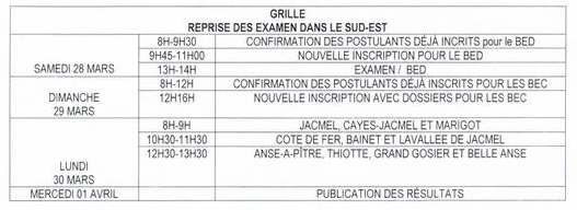 La reprise du concours pour le département du Sud-Est devant aboutir à la mise en place des organes déconcentrés du CEP, c'est-à-dire le BED et les BEC, est prévue comme l'indique le calendrier suivant, à l'école JM Henriquez, Worf 3, tout près du cimetière de Jacmel :