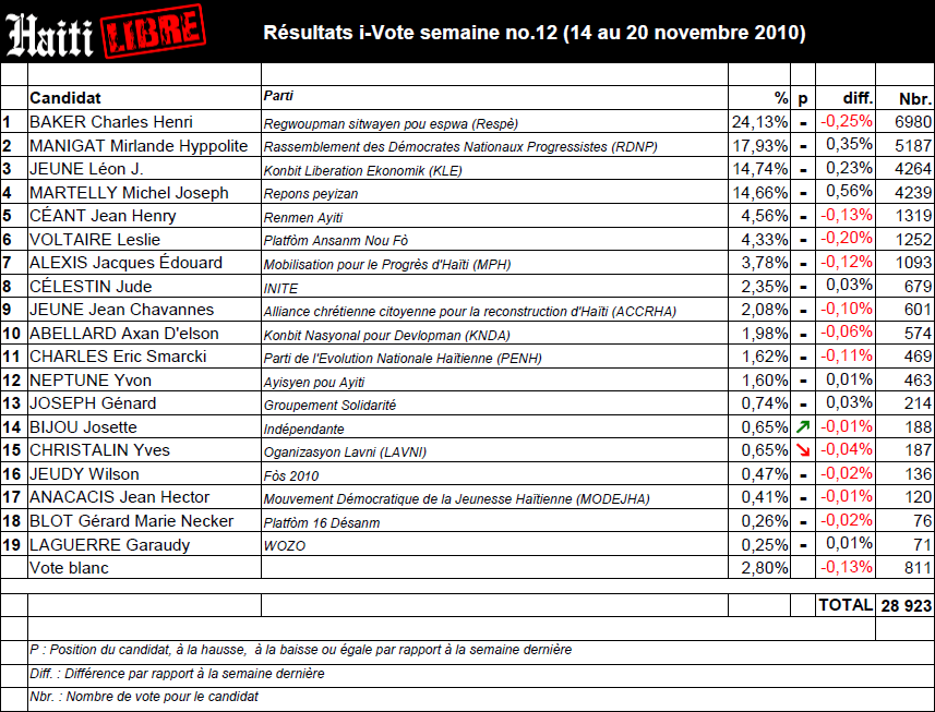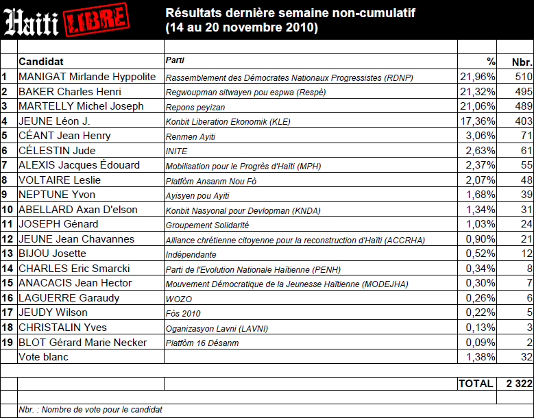 Résultats NON CUMULATIF dernière semaine du 14 au 20 novembre 2010 Nombre de i-Votes : 2,322 (1) Mirlande Manigat : 510 i-votes (21.96 %) (2) Charles Henri Baker : 495 i-votes (21.32 %) (3) Michel Joseph Martelly : 489 i-Votes (21.06%) (4) Léon Jeune : 403 i-Votes (17.36 %) (5) Jean Henry Céant : 71 i-Votes (3.06 %) (6) Jude Célestin : 61 i-Votes (2.63 %) (7) Jacque Édouard Alexis : 55 i-Votes (2.37 %) (8) Leslie Voltaire : 48 i-Votes (2.07 %)