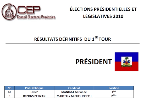 Alors que le Conseil Électoral Provisoire (CEP) annonce officiellement la longue liste des résultats définitifs du premier tour, nous vous confirmons que MANIGAT Mirlande Hyppolite «Rassemblement des Démocrates Nationaux Progressistes (RDNP)» et MARTELLY Michel Joseph «Repons peyizan» remportent le premier tour donc, que ces deux candidats s’affronteront au second tour.