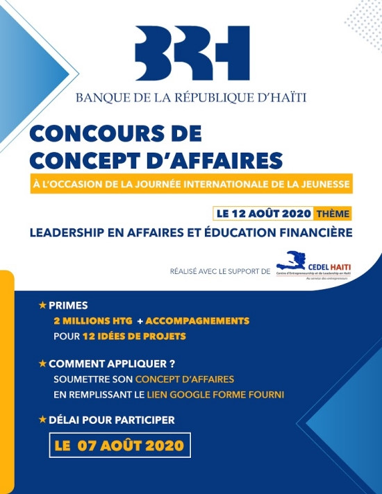 Dans le cadre de la journée internationale de la jeunesse (12 août) la Banque de la République d’Haïti (BRH) a décidé d’organiser les 12 et 13 août 2020 un Forum de jeunes sous le thème « Leadership et éducation financière ». Dans le cadre de cet événement, la BRH compte mettre l’accent sur la nécessité de renforcer et d'activer les initiatives capables de promouvoir l’éducation financière en Haïti. Aussi, compte tenu de l’importance de l’éducation financière dans la réussite des entrepreneurs, la Banque centrale a décidé d’organiser, en marge du Forum, un concours d’entrepreneuriat durant lequel les gagnants auront à faire des expériences pratiques pour renforcer leurs compétences en éducation financière. Critères de participation :