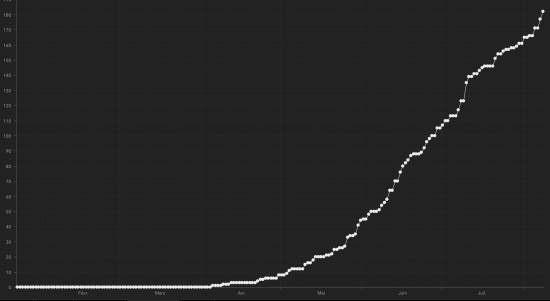 Guérisons : : 4,893 personnes (inchangé en 48h), précédent (+61 en 72h) Taux de guérison : 64.29% (-) Cas actifs : (moins décès et guérisons) 2,536 (+7 en 24h), la veille : (+11) Cas importés : 152 cas depuis la réouverture des aéroports et +43 depuis le dernier bilan datant du 9 juillet (109) https://www.haitilibre.com/article-31348-haiti-flash-152-cas-importes-depuis-la-reouverture-des-aeroports.html (actualisation non disponible) Cas suspects investigués depuis le 19 mars : 19,864 cas (+263 en 24h), précédent (+250) Cas testés depuis le début de la pandémie : 18,921 (+145 tests en 24h en date du 6 août) Personnes hospitalisées actuellement : (information non disponible) Personnes en soins intensifs actuellement : (information non disponible) Personnes en quarantaine à domicile actuellement : (information non disponible) Cas confirmés par département : Ouest : 5,377 cas (+9), la veille : (+12) Artibonite : 443 cas (inchangé), la veille : (+1) Centre : 378 cas (inchangé) Nord : 360 cas (+3), la veille : (+2) Sud-Est : 215 cas (inchangé), la veille : (+1) Sud : 210 cas (inchangé) Nord-Est : 180 cas (inchangé) Nord-Ouest : 170 cas (inchangé, la veille : (+1) Grand’Anse : 154 cas (inchangé) Nippes : 124 cas (inchangé) Localisation des cas : Ouest : 5,377 cas (+9) Delmas : 1,314 cas (+1), la veille : (+3) Port-au-Prince : 1,097 cas (inchangé) Pétion-ville : 799 cas (+1), la veille : (+3) Tabarre : 656 cas (+1) Croix-des-Bouquets : 514 cas (+3), la veille : (+2) Carrefour : 407 cas (inchangé), la veille : (+1) Petit-Goâve : 140 cas (inchangé) Cité Soleil : 91 cas (inchangé) Cabaret : 72 cas (inchangé) Léogâne : 68 cas (+1), la veille : (+2) Kenskoff : 57 cas (inchangé) Gressier 41 cas (+1), la veille : (+1) Archaie : 37 cas (inchangé) Anse à Galet : 34 cas (inchangé) Grand Goâve : 13 cas (+1) Ganthier : 11 cas (inchangé) Thomazeau : 9 cas (inchangé), la veille : (+1) Cornillon : 8 cas (inchangé) Fonds-Verettes : 6 (inchangé) Pointe à Raquette : 3 cas (inchangé) Artibonite : 443 cas (inchangé) Saint Marc : 152 cas (inchangé), la veille : (+1) Verettes : 104 cas (inchangé) Gonaïves : 102 cas (inchangé) Gros Morne : 18 cas (inchangé) Marchand Dessalines : 15 cas (inchangé) Petite Rivière de l’Artibonite : 14 cas (inchangé) L’Estère : 9 cas (inchangé) Saint Michel : 7 cas (inchangé) Desdunes : 6 cas (inchangé) Marmelade : 6 cas (inchangé) Ennery : 3 cas (inchangé) Grande Saline : 3 cas (inchangé) La Chappelle : 2 cas (inchangé) Anse Rouge : 2 cas (inchangé) Centre : 378 cas (inchangé) Mirebalais : 142 cas (inchangé) Hinche : 131 cas (inchangé), Boucan Carré : 30 cas (inchangé) Lascaobas : 25 cas (inchangé) Belladère : 17 cas (inchangé) Thomonde : 12 cas (inchangé) Savanette : 6 cas (inchangé) Saut-d’Eau 5 cas (inchangé) Cerca la Source : 4 cas (inchangé) Maissade : 3 cas (inchangé) Cerca Cavajal : 2 cas (inchangé) Thomassique : 1 cas (inchangé) Nord : 360 cas (+3) Cap Haïtien : 219 cas (+3), la veille : (+2) Limbé : 27 cas (inchangé) Pignon : 17 cas (inchangé) Grande Rivière du Nord : 14 cas (inchangé) Milot : 13 cas (inchangé) Plaine du Nord : 11 cas (inchangé) Borgne : 11 cas (inchangé) Limonade : 10 cas (inchangé) Plaisance du Nord : 9 cas (inchangé) Quartier Morin : 8 cas (inchangé) Pilate : 7 cas (inchangé) Acul du Nord : 5 cas (inchangé) Port Margot : 4 cas (inchangé)inchangé Dondon : 3 cas (inchangé) Bahon : 1 cas (inchangé) Saint Raphaël : 1 cas (inchangé) Sud-Est : 215 cas (inchangé) Jacmel : 163 cas (inchangé), la veille : (+1) Côte-de-Fer : 14 cas (inchangé) Bainet : 13 cas (inchangé) Vallée de Jacmel : 7 cas (inchangé) Thiotte : 7 cas (inchangé) Marigot : 4 cas (inchangé) Belle Anse : 3 cas (inchangé), Anse-à-Pitre : 2 cas (inchangé) Cayes Jacmel : 2 cas (inchangé) Sud : 210 cas (inchangé) Cayes : 119 cas (inchangé) Aquin : 21 cas (inchangé) Saint-Louis du Sud : 11 cas (inchangé) Les Anglais : 10 cas (inchangé) Port-Salut : 8 cas (inchangé) Torbeck : 7 cas (inchangé) Chardonnières : 6 cas (inchangé) Camp-Perrin : 6 cas (inchangé) Port à Piment : 5 cas (inchangé) Tiburon : 4 cas (inchangé) Coteaux : 3 cas (inchangé) Chantal : 2 cas (inchangé) Île-à Vache : 2 cas (inchangé) St Jean du Sud : 2 cas (inchangé) Cavaillon 2 cas (inchangé) Roche à Bateau : 1 cas (inchangé) Maniche : 1 cas (inchangé) Nord-Est : 180 cas (inchangé) Ouanaminthe : 57 cas (inchangé) Caracol 36 cas (inchangé) Trou du Nord : 28 cas (inchangé) Fort Liberté : 24 cas (inchangé) Mombin Crochu 13 cas (inchangé) Terrier Rouge : 7 cas (inchangé) Mont Organisé : 5 cas (inchangé) Perches : 4 cas (inchangé) Carice : 2 cas (inchangé) Capotille : 2 cas (inchangé) Ferrier : 1 cas (inchangé) Ste-Suzanne : 1 cas (inchangé) Nord-Ouest : 170 cas (inchangé) Port de Paix : 105 cas (inchangé) Saint-louis du Nord : 18 cas (inchangé), la veille (+1) Bombardopolis : 13 cas (inchangé) Môle Saint-Nicolas : 12 cas (inchangé) Jean Rabel : 10 cas (inchangé) Chansolme : 4 cas (inchangé) La Tortue : 4 cas (inchangé) Baie de Henne 2 cas (inchangé) Anse-à-Foleur : 1 cas (inchangé) Bassin Bleu : 1 cas (inchangé) Grand'Anse : 154 cas (inchangé) Jérémie : 121 cas (inchangé) Anse d’Hainault : 16 (inchangé) Chambellan : 7 cas (inchangé) Dame Marie : 3 cas (inchangé) Pestel : 2 cas (inchangé) Irois : 2 cas (inchangé) Bonbon : 1 cas (inchangé) Moron : 1 cas (inchangé) Roseaux : 1 cas (inchangé) Nippes : 124 cas (inchangé) Miragoâne : 59 cas (inchangé) Fond des Nègres : 18 cas (inchangé) Baradères : 12 cas (inchangé) Anse à Veau 7 cas (inchangé) Petite Riviere de Nippes : 6 cas (inchangé) Plaisance du Sud : 6 cas (inchangé) Petit Trou de Nippes : 5 cas (inchangé) L’Asile : 5 cas (inchangé) Paillant : 4 cas (inchangé) Arnaud : 1 cas (inchangé) Grand Boucan : 1 cas (inchangé) NOTE : « inchangé » signifie qu’il n’y a pas de nouvelles données disp