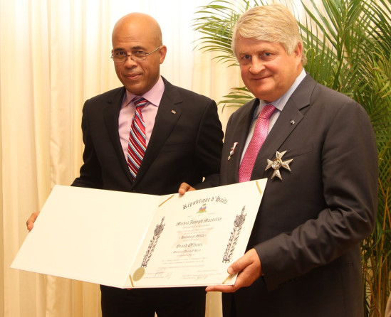 Le Président Michel Martelly, a décoré mardi au Palais National, le Président de la compagnie Digicel, Denis O’Brien, pour sa dynamique implication dans le social et sa contribution dans le développement des télécommunications dans le pays. Dans son allocution de circonstance, le Chef de l’État a déclaré : « Cette distinction témoigne de mon appréciation personnelle et de celle de la Nation pour ce que vous et votre compagnie avez réalisés en Haïti. Non seulement la Digicel est devenu un partenaire incontournable de notre secteur des télécommunications, mais elle s'est lancée dans des investissements sociaux sans précédents dans le pays; l'art, l'enseignement ou le sport, ont bénéficié des attentions de votre équipe dans les différents Départements du pays. Lorsque le séisme de janvier 2010 a secoué non seulement la terre, mais l'ensemble des familles haïtiennes, votre compagnie s'est révélée être un modèle de solidarité pour ses clients et également pour l'ensemble des citoyens affectés [...] Nous n'oublierons jamais, que grâce à la Digicel, un des joyaux de l'architecture de Port-au-Prince : « le Marché Hyppolite » communément appelé - marché en fer -, a pu être restauré. Nous n'oublierons pas non plus, la mise sur pied d'un programme de réhabilitation de 50 écoles affectée par le séisme.