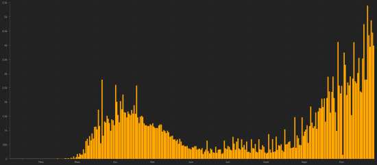 SITUATION MONDIALE : Jeudi 12 novembre 2020, le nombre de personnes contaminées dans le monde par le coronavirus Covid-19 depuis le début de la pandémie (Source officielle), s’élève à 52,208,441 (+660,180 en 24h), la veille (+634,810), Nombre de pays contaminés 190 (inchangé) Bulletin de la veille : https://www.haitilibre.com/article-32265-haiti-diaspora-covid-19-bulletin-quotidien-11-novembre-2020.html Depuis le début de la pandémie 33,976,496 personnes ont été guéries du Covid-19 dans le monde (+377,963 en 24h), la veille (+309,129) Depuis le début de la pandémie 1,285,709 personnes sont mortes du Covid-19 dans le monde (+12,067 en 24h), la veille (+10,553) Le nombre de cas actifs dans le monde (excluant les décès et les guérisons) est actuellement de 16,946,236 cas (+270,150 en 24h), la veille (+315,128) Monde : Nombre de cas confirmés quotidiens