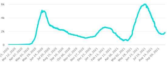 Cas testés depuis le début de la pandémie : 122,576 cas (+961 en 48h) mise à jour 30 septembre 2021 dernières données disponibles. Notez que le très faible nombre de personnes testées ne permet pas statistiquement de faire une estimation représentative des cas actifs de Covid-19 en Haïti. Ce qui explique également le faible nombre de cas détecté quotidiennement. À titre de comparaison la République voisine a plus de 2 millions de tests sur sa population depuis le début de l’épidémie. Communes les plus touchées dans l’Ouest (2021) : Delmas : 2,077 (+17) ; Pétion ville 1,747 (+5) ; Port-au-Prince 1,141 (+17) ; Tabarre 902 (+10) ; Croix-des-Bouquets 929 (+9) Cas confirmés par département (2021) : Ouest : 7,919 cas (2020 : 6,945 cas) Nord : 530 cas (2020 : 677 cas) Centre : 732 cas (2020 : 508 cas) Artibonite : 611 cas (2020 : 593 cas) Nord-Est : 306 cas (2020 : 314 cas) Sud-Est : 417 cas (2020 : 274 cas) Sud : 625 cas (2020 : 262 cas) Nord-Ouest : 281 cas (2020 : 229 cas) Grand'Anse : 539 cas (2020 : 176 cas) Nippes : 186 cas (2020 : 149 cas) Décès cumulés par département (2021) : Ouest : 208 décès (2020 : 104 décès) Nord : 40 décès (2020 : 34 décès) Centre : 30 décès (2020 : 13 décès) Artibonite : 22 décès (2020 : 39 décès) Nord-Est : 6 décès (2020 : 6 décès) Sud : 35 décès (2020 : 6 décès) Sud-Est : 11 décès (2020 : 9 décès) Nord-Ouest : 12 décès (2020 : 12 décès) Grand'Anse : 5 décès (2020 : 13 décès) Nippes : 17 décès (2020 : 5 décès) Répartition des décès par âge (depuis le début de l’épidémie) : 0-9 ans : 13 décès 10-19 ans : 6 décès 20-29 ans : 24 décès 30-39 ans : 37 décès 40-49 ans : 67 décès (+1) 50-59 ans : 108 décès (+1) 60-69 ans : 139 décès (+2) 70-79 ans : 139 décès (+1) 80 ans et plus : 96 décès (+2) Vaccination : 66,682 (+5,404 en 4 jours) doses de vaccin « Spikevax » (appellation officielle) du Laboratoire MODERNA ont été injectés au total en Haïti depuis le 16 juillet 2021, date de la première injection. 20,013 personnes sont entièrement vaccinées (2 doses). Mise à jour 25 septembre 2021, dernières données disponibles. Liste des 75 Centres de vaccination ouverts en Haïti (et horaires) par département : (mise à jour 20 septembre 2021) DIASPORA : Situation épidémiologique : USA : *Cas depuis le premier cas (9 mars 2020) : 44,682,835 cas (+164,398 en 24h), la veille (+27,540) *Guérisons : 34,154,777 guérisons (+216,630 en 24h), la veille (+20,188) Taux national de Guérison : 76,43% (=) *Décès : 722,268 décès (+2,335 en 24h), la veille (+259) Taux national de mortalité : 1,61% (=) *Cas actifs (moins décès et guérisons) : 9,805,790 cas (-54,567), la veille (+7,093) *Tests : 649,261,344 personnes testées depuis le premier cas USA : Nombre de cas confirmés quotidiens :