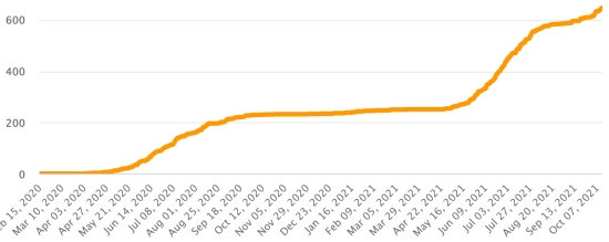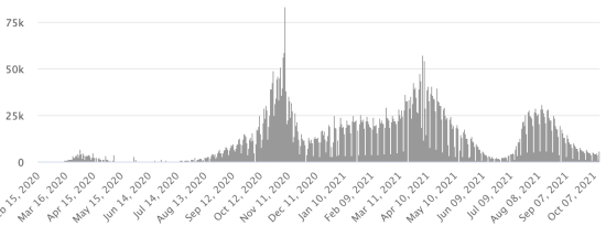 Vaccination : 403,58 millions de doses de vaccin injectées depuis le 14 décembre 2020 date de la première injection aux États-Unis (1,76 millions de doses injectées, en 3 jours). Mise à jour 12 octobre 2021 (dernières données disponibles).