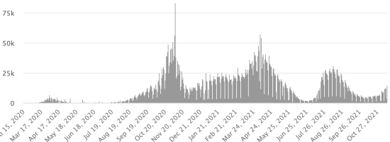SITUATION MONDIALE : Situation épidémiologique : Dimanche 14 novembre 2021 le nombre de personnes contaminées dans le monde par le coronavirus Covid-19 depuis le début de la pandémie (Source officielle), s’élève à 253,714,999 cas (+428,386 en 24h), la veille (+540,320) Nombre de pays contaminés : 221 *Guérisons : 229,429,889 personnes ont été guéries du Covid-19 dans le monde (+358,485 en 24h), la veille (+405,344) *Décès : 5,111,757 personnes sont mortes du Covid-19 dans le monde (+6,255 en 24h), la veille (+7,291) *Cas actifs (moins décès et guérisons) dans le monde est actuellement de 19,173,353 cas (+63,646 en 24h), la veille (+127,685) Taux moyen de guérison au monde : 90,42% (-) Taux moyen de mortalité au monde : 2,01% (=) Monde : Nombre de cas confirmés quotidiens :