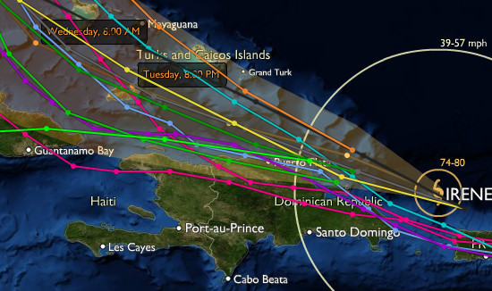 Le passage d’Irène pourrait être relativement « moins grave » qu’initialement prévu https://www.haitilibre.com/article-3628-haiti-meteo-irene-s-en-vient.html , en raison de son changement de trajectoire vers le Nord. Irene se déplace actuellement à 20 km/h (13 mi/h) le long d’une trajectoire Ouest Nord-Ouest, suivant la trajectoire actuelle, son centre devrait passer juste au Nord de l'île d'Hispaniola plus tard aujourd'hui ou tôt demain. En Haïti, la zone la plus affectée pourrait s'étendre du côté Ouest, Môle Saint-Nicolas jusqu'à la frontière Dominicaine, côté Est. À 10h00 du matin, ce lundi, le centre d’Irene était situé à 19.2 degré Nord et 67.5 degrés Ouest. À 495 km au Sud Est du Cap Haïtien (308 miles) avec des vents soutenus (maximum) de 130 km/h (80 mi/h) avec de fortes rafales. Les vents fort soufflent dans un rayon de 45 km (30 mi) à partir du centre. Les vents de tempêtes s'étendent vers l'extérieur sur 295 km (185 mi) au Nord-Est à partir du centre. Le Centre National Météorologie (CNM) de concert avec le Service Maritime et de Navigation d'Haïti (SEMANAH) interdit les opérations de cabotages sur toute la côte Nord d'Haïti jusqu'à nouvel ordre.
