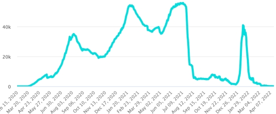 (Jour-1) Vaccination : 567,81 millions de doses de vaccin injectées depuis le 14 décembre 2020 date de la première injection aux États-Unis (+190,000). Mise à jour 18 avril (dernières données disponibles). RÉPUBLIQUE DOMINICAINE : Cas confirmés depuis le 1er mars 2020 : 578,733 cas (+28 en 24h) la veille (+42 en 37). Premier cas (1er mars 2020) Guérisons : 574,240 guérisons (+63 en 24h), la veille (+7) Taux national de Guérison : 99,22% (+) Décès : 4,375 décès (+0), précédent (+0) Taux de mortalité : 0,75% (=) Taux de positivité sur 4 semaines épidémiologiques : 0,71% (=) Cas actifs : (excluant décès et guérisons) 118 cas (-35 en 24h) la veille (+35) République Dominicaine : Tendance cas actifs : (moins guérisons et décès)