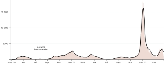 (tendance moyenne hebdomadaire) Vaccination : 19,137,973 doses de vaccin injectées depuis le 14 décembre 2020 date de la première injection (+174,066 doses en 4 jours), dernières données disponibles - MSSS en date du 19 avril 2022) FRANCE : *Cas confirmés depuis le premier cas (24 janvier 2020) : 27,816,299 cas (+25,465 cas en 24h), précédent (+19,810) *Guérisons : 25,301,145 guérisons (+168,842), précédent (+217,432) Taux national de Guérison : 90,95% (+) Décès : 144,387 (+182 en 24h), précédent (+48) Taux de mortalité : 0,51% (=) Cas Actifs : 2,370,767 (+143,559 en 24h), précédent (+197,670) France : Tendance cas actifs : (moins guérisons et décès)