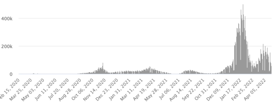 SITUATION MONDIALE 2019-2022 : Situation épidémiologique : Mardi 26 avril 2022 le nombre de personnes contaminées dans le monde par le coronavirus Covid-19 et ses variants depuis le début de la pandémie (11 mars 2020) s’élève à 510,138,045 cas (+525,553 en 24h), la veille (+364,413) Nombre de pays contaminés : 225 *Guérisons : 463,449,004 personnes ont été guéries du Covid-19 dans le monde (+947,240 en 24h), la veille (+706,686) *Décès : 6,245,953 personnes sont mortes du Covid-19 dans le monde depuis le début de la pandémie (+2,442 en 24h), la veille (+1,223) *Cas actifs (moins décès et guérisons) dans le monde est actuellement de 40,443,088 cas (-424,129 en 24h), la veille (-343,779) Taux moyen de guérison au monde : 90,84% (+) Taux moyen de mortalité au monde : 1,22% (=) Monde : Nombre de cas confirmés quotidiens :
