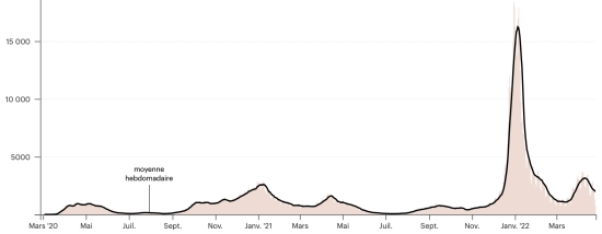 (tendance moyenne hebdomadaire) Vaccination : 19,333,940 doses de vaccin injectées depuis le 14 décembre 2020 date de la première injection (+76,859 doses en 48h), dernières données disponibles - MSSS en date du 20 avril 2022) FRANCE : *Cas confirmés depuis le premier cas (24 janvier 2020) : 28,317,915 cas (+13,984 cas en 24h), la veille (+58,954) *Guérisons : 26,083,264 guérisons (+202,824), la veille (+27,608) Taux national de Guérison : 92,10% (+) Décès : 145,257 décès (+197 en 24h), la veille (+40) Taux de mortalité : 0,51% (=) Cas Actifs : 2,089,394 (-189,037 en 24h), la veille (+31,306) France : Nombre de cas confirmés quotidiens :