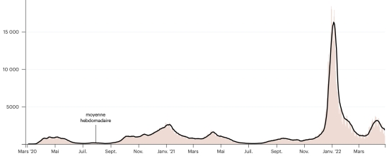 (tendance moyenne hebdomadaire) Vaccination : 19,393,611 doses de vaccin injectées depuis le 14 décembre 2020 date de la première injection (+29,967 doses en 24h), dernières données disponibles - MSSS en date du 20 avril 2022) FRANCE : *Cas confirmés depuis le premier cas (24 janvier 2020) : 28,483,124 cas (+67,711 cas en 24h), la veille (+97,498) *Guérisons : 26,403,684 guérisons (+158,640), la veille (+161,780) Taux national de Guérison : 92,69% (+) Décès : 145,579 décès (+152 en 24h), la veille (+170) Taux de mortalité : 0,51% (=) Cas Actifs : 1,933,861 (-91,081 en 24h), la veille (-64,452) France : Nombre de cas confirmés quotidiens :