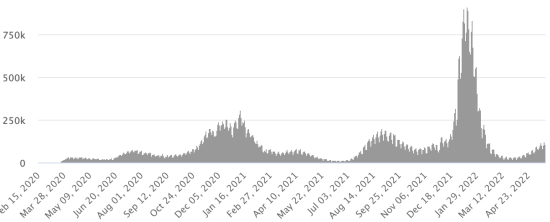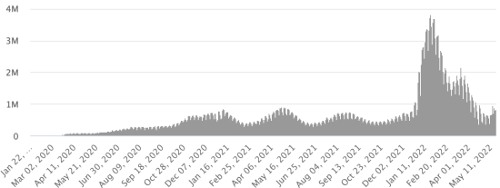 SITUATION MONDIALE 2019-2022 : Situation épidémiologique : Samedi 21 mai 2022 le nombre de personnes contaminées dans le monde par le coronavirus Covid-19 et ses variants depuis le début de la pandémie (11 mars 2020) s’élève à 526,815,632 cas (+788,356 en 24h), la veille (+829,901) Nombre de pays contaminés : 225 *Guérisons : 496,636,950 personnes ont été guéries du Covid-19 dans le monde (+834,176 en 24h), la veille (+805,832) *Décès : 6,299,098 personnes sont mortes du Covid-19 dans le monde depuis le début de la pandémie (+1,781 en 24h), la veille (+2,282) *Cas actifs (moins décès et guérisons) dans le monde est actuellement de 23,879,584 cas (-47,601 en 24h), la veille (+21,787) Taux de guérison au monde : 94,27% (+) Taux de mortalité au monde : 1,19% (=) Monde : Nombre de cas confirmés quotidiens :
