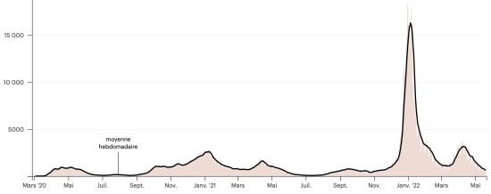 (tendance moyenne hebdomadaire) Vaccination : 19,824,501 doses de vaccin injectées depuis le 14 décembre 2020 date de la première injection (+12,640 doses en 24h), dernières données disponibles - MSSS) FRANCE : *Cas confirmés depuis le premier cas (24 janvier 2020) : 29,315,478 cas (+24,332 cas en 24h), la veille (+27,842) *Guérisons : 28,497,505 guérisons (+49,417 en 24h), la veille (+52,852) Taux national de Guérison : 97,20% (+) Décès : 147,780 décès (+65 en 24h), la veille (+67 en 48h) Taux de mortalité : 0,50% (=) Cas Actifs : 670,193 (-25,150 en 24h), la veille (-25,077) France : Nombre de cas confirmés quotidiens :