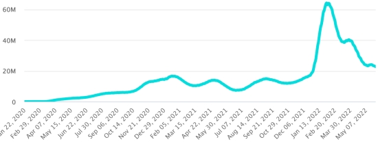 SITUATION MONDIALE 2019-2022 : Situation épidémiologique : Mardi 31 mai 2022 le nombre de personnes contaminées dans le monde par le coronavirus Covid-19 et ses variants depuis le début de la pandémie (11 mars 2020) s’élève à 532,214,335 cas (+463,368 en 24h), la veille (+279,156) Nombre de pays contaminés : 225 *Guérisons : 503,175,348 personnes ont été guéries du Covid-19 dans le monde (+504,306 en 24h), la veille (+559,941) *Décès : 6,312,118 personnes sont mortes du Covid-19 dans le monde depuis le début de la pandémie (+1,087 en 24h), la veille (+415) *Cas actifs (moins décès et guérisons) dans le monde est actuellement de 22,726,869 cas (-42,025 en 24h), la veille (-281,200) Taux de guérison au monde : 94,54% (+) Taux de mortalité au monde : 1,18% (=) Monde : Tendance cas actifs : (moins guérisons et décès)