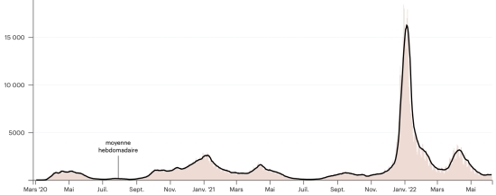 (tendance moyenne hebdomadaire) Vaccination : 19,951,260 doses de vaccin injectées depuis le 14 décembre 2020 date de la première injection (+5,155 doses en 24h), dernières données disponibles - MSSS) FRANCE : *Cas confirmés depuis le premier cas (24 janvier 2020) : 29,713,219 cas (+53,802 cas en 24h), la veille (+11,627) *Guérisons : 29,142,478 guérisons (+27,765 en 24h), la veille (+29,868) Taux national de Guérison : 98,07% (-) Décès : 148,668 décès (+77 en 48h), la veille (+127) Taux de mortalité : 0,50% (=) Cas Actifs : 422,073 (+25,960 en 24h), la veille (-18,368) France : Nombre de cas confirmés quotidiens :