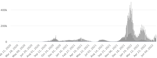 Vaccination : 12,06 millards de doses de vaccin injectées (). (Dernières données disponibles). HAÏTI : Selon le Ministère de la Santé Publique, +22 nouveaux cas de Covid-19 et de ses variants auraient été confirmés en Haïti en date du 19 juin 2022 (dernières données partielles disponibles) pour un total de 31,248 cas confirmés sur l’ensemble du territoire national (48,7% de femmes et 51,3% hommes), depuis le premier cas (19 mars 2020 https://www.haitilibre.com/article-30319-haiti-sante-origine-des-2-premiers-cas-de-covid-19-en-haiti.html ). Précédente mise à jour (+31 cas en date du 17 juin 2022). Guérisons : 29,815 (+2) Taux de guérison : 95,41% (-) Décès : 837 décès (+0) Taux de mortalité : 2,67% (-) Dépistage depuis le début de la pandémie : 206,819 tests depuis le 19 mars 2020 (+225 en 2 jours) un nombre de tests insuffisant statistiquement pour être représentatif de la situation sanitaire, ce qui se traduit par un nombre de cas confirmés quotidiennement largement sous-évalué de l’avis des spécialistes de la santé. TOP 5 des Communes les plus touchées dans l’Ouest (2022) : Delmas : 831 (+1) ; Pétion-ville 669 (+1) ; Port-au-Prince 439 (+0) ; Tabarre 336 (+1) ; Croix-des-Bouquets 272 (+0) Cas confirmés par département (2022 / 2021 / 2020) : Ouest : 2022 : 2,837 (+) cas ; (2021 : 9,890) ; (2020 : 6,945 cas) Nord : 2022 : 306 (+) cas ; (2021 : 664) ; (2020 : 677 cas) Centre : 2022 : 298 (+) cas ; (2021 : 1,001) ; (2020 : 508 cas) Artibonite : 2022 : 202 (+) cas ; (2021 : 855) ; (2020 : 593 cas) Nord-Est : 2022 : 194 (=) cas ; (2021 : 404) ; (2020 : 314 cas) Sud-Est : 2022 : 327 (=) cas ; (2021 : 768) ; (2020 : 274 cas) Sud : 2022 : 233 (=) cas ; (2021 : 891) ; (2020 : 262 cas) Nord-Ouest : 2022 : 306 (+) cas ; (2021 : 383) ; (2020 : 229 cas) Grand'Anse : 2022 : 230 (=) cas ; (2021 : 861) ; (2020 : 176 cas) Nippes : 2022 : 90 (+) cas ; (2021 : 249) (2020 : 149 cas) Décès cumulés par département (2022-2021) : Ouest : 298 décès (2020 : 104 décès) Nord : 54 décès (2020 : 34 décès) Centre : 79 décès (2020 : 13 décès) Artibonite : 42 décès (2020 : 39 décès) Nord-Est : 7 décès (2020 : 6 décès) Sud : 51 décès (2020 : 6 décès) Sud-Est : 15 décès (2020 : 9 décès) Nord-Ouest : 15 décès (2020 : 12 décès) Grand'Anse : 7 décès (2020 : 13 décès) Nippes : 27 décès (2020 : 5 décès) Répartition des décès par âge (depuis le début de l’épidémie) : 0-9 ans : 15 décès 10-19 ans : 10 décès 20-29 ans : 31 décès 30-39 ans : 56 décès 40-49 ans : 80 décès 50-59 ans : 135 décès 60-69 ans : 188 décès 70-79 ans : 184 décès 80 ans et plus : 138 décès Vaccination : 219,752 haïtiens (2,43% de la population) +28,184 en 5 jours ont reçu une 1ère dose de vaccin depuis le 16 juillet 2021 date de la première injection à travers 149 centres de vaccinations ouverts et 145,544 haïtiens sont entièrement vaccinés (2 doses, 1,25% de la population) +11,019 en 5 jours. Mise à jour 20 juin 2022 dernières informations disponibles (source MSPP). Liste des 149 Centres de vaccination ouverts en Haïti (et horaires) par département : (mise à jour 20 octobre 2021, dernières informations disponibles) DIASPORA : Situation épidémiologique : USA : *Cas depuis le premier cas (29 février 2020) : 88,566,961 cas (+123,563 en 24h), la veille (+198,528) *Guérisons : 84,257,913 guérisons (+104,534 en 24h), la veille (+112,902) Taux national de Guérison : 95,13% (-) Décès : 1,040,236 (+465 en 24h), la veille (+871) Taux de mortalité : 1,17% (=) *Cas actifs (moins décès et guérisons) : 3,268,812 (+18,564 en 24h), la veille -+84,755) USA : Nombre de cas confirmés quotidiens :