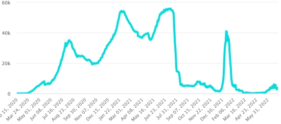 Vaccination : 597,10 millions de doses de vaccin injectées depuis le 14 décembre 2020 date de la première injection aux États-Unis (+210,000 doses). (Dernières données disponibles). RÉPUBLIQUE DOMINICAINE : Cas confirmés depuis le 1er mars 2020 : 606,812 cas (+1,028 en 24h), la veille (+1,014). Premier cas (1er mars 2020) Guérisons : 598,584 guérisons (-114 cas, correction Direction centrale d'épidémiologie dominicaine), la veille (+2,312) Taux national de Guérison : 98,64% (-) Décès : 4,383 décès (+0), la veille (+0) Taux de mortalité : 0,72% (=) Taux de positivité sur 4 semaines épidémiologiques : 13,09% (+) Cas actifs : (excluant décès et guérisons) 3,845 cas (+1,142 en 24h) la veille (-1,298) République Dominicaine : Nombre de cas confirmés quotidiens :