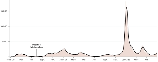 TOP 5 des Provinces ayant le plus de nouveaux cas les dernières 24h : Distrito Nacional : +570 nouveaux cas en 24h (+) Santiago : +196 nouveaux cas en 24h (+) Santo Domingo : +153 nouveaux cas en 24h (-) Valverde : + 38 nouveaux cas (-) La Altagracia 31 nouveaux cas (+) Vaccination : 15,79 millions de doses de vaccin injectées depuis le 16 février 2021, date de la première injection en République Dominicaine (+10,000 doses). (Dernières données disponibles). QUÉBEC : Cas confirmés depuis le premier cas (27 février 2020) : 1,096,172 (+1,356 en 24h), précédent (4,504 en 72h) Décès : 15,617 (+20 en 24h) précédent (+8 en 72h) Taux de mortalité : 1,42% (=) Guérison : Le Centre d'expertise et de référence en santé publique ne rend plus disponible cette information. Québec : Nombre de cas confirmés quotidiens : (tendance 7 jours)