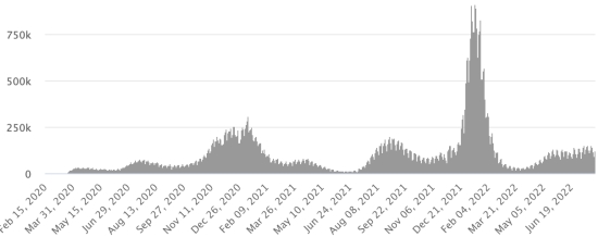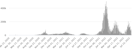 Vaccination : 12,37 millards de doses de vaccin injectées (+10 millions de doses). (Dernières données disponibles). HAÏTI : Avertissement : Le Ministère de la Santé Publique et de la Population (MSPP) n'as pas rendu disponible après le 17 juillet 2022 les données quotidiennes sur la situation du Covid-19 en Haïti. En conséquence, les données ci-dessous sur la situation en Haïti sont les dernières disponibles. Selon le Ministère de la Santé Publique, +45 nouveaux cas de Covid-19 et de ses variants auraient été confirmés en Haïti en date du 17 juillet 2022 (dernières données partielles disponibles) pour un total de 32,223 cas confirmés sur l’ensemble du territoire national (48,9% de femmes et 51,1% hommes), depuis le premier cas (19 mars 2020 https://www.haitilibre.com/article-30319-haiti-sante-origine-des-2-premiers-cas-de-covid-19-en-haiti.html ). Précédente mise à jour (+47 cas en date du 15 juillet 2022). Guérisons : 29,946 (+21) Taux de guérison : 92,93% (-) Décès : 838 décès (+0) Taux de mortalité : 2,60% (=) Dépistage depuis le début de la pandémie : 212,153 tests depuis le 19 mars 2020 (+193 en 2 jours) un nombre de tests pour l’ensemble du territoire national, insuffisant statistiquement pour être représentatif de la situation sanitaire, ce qui se traduit par un nombre de cas confirmés quotidiennement largement sous-évalué de l’avis des spécialistes de la santé. TOP 5 des Communes les plus touchées dans l’Ouest (2022) : Delmas : 996 (+5) ; Pétion-ville 758 (+2) ; Port-au-Prince 487 (+0) ; Tabarre 423 (+1) ; Croix-des-Bouquets 354 (+3) Cas confirmés par département (2022 / 2021 / 2020) : Ouest : 2022 : 3,369 (+) cas ; (2021 : 9,890) ; (2020 : 6,945 cas) Nord : 2022 : 355 (+) cas ; (2021 : 664) ; (2020 : 677 cas) Centre : 2022 : 355 (+) cas ; (2021 : 1,001) ; (2020 : 508 cas) Artibonite : 2022 : 278 (+) cas ; (2021 : 855) ; (2020 : 593 cas) Nord-Est : 2022 : 247 (+) cas ; (2021 : 404) ; (2020 : 314 cas) Sud-Est : 2022 : 356 (+) cas ; (2021 : 768) ; (2020 : 274 cas) Sud : 2022 : 293 (+) cas ; (2021 : 891) ; (2020 : 262 cas) Nord-Ouest : 2022 : 387 (+) cas ; (2021 : 383) ; (2020 : 229 cas) Grand'Anse : 2022 : 242 (+) cas ; (2021 : 861) ; (2020 : 176 cas) Nippes : 2022 : 116 (=) cas ; (2021 : 249) (2020 : 149 cas) Décès cumulés par département (2022-2021) : Ouest : 299 décès (2020 : 104 décès) Nord : 54 décès (2020 : 34 décès) Centre : 79 décès (2020 : 13 décès) Artibonite : 42 décès (2020 : 39 décès) Nord-Est : 7 décès (2020 : 6 décès) Sud : 51 décès (2020 : 6 décès) Sud-Est : 15 décès (2020 : 9 décès) Nord-Ouest : 15 décès (2020 : 12 décès) Grand'Anse : 7 décès (2020 : 13 décès) Nippes : 27 décès (2020 : 5 décès) Répartition des décès par âge (depuis le début de l’épidémie) : 0-9 ans : 15 décès 10-19 ans : 10 décès 20-29 ans : 31 décès 30-39 ans : 56 décès 40-49 ans : 80 décès 50-59 ans : 135 décès 60-69 ans : 188 décès 70-79 ans : 185 décès (+1) 80 ans et plus : 138 décès Vaccination : 248,075 haïtiens (2,13% de la population) +1,828 en 21 jours ont reçu une 1ère dose de vaccin depuis le 16 juillet 2021 date de la première injection à travers 149 centres de vaccinations ouverts et 161,066 haïtiens sont entièrement vaccinés (2 doses, 1,38% de la population) +1,723 en 21 jours. Mise à jour 10 juillet 2022 dernières informations disponibles (source MSPP). Liste des 149 Centres de vaccination ouverts en Haïti (et horaires) par département : (mise à jour 20 octobre 2021, dernières informations disponibles) DIASPORA : Situation épidémiologique : USA : *Cas depuis le premier cas (29 février 2020) : 92,761,865 cas (+267,847 en 24h), la veille (+154,093 en 24h) *Guérisons : 87,772,164 guérisons (+123,326 en 24h), la veille (+99,223 en 24h) Taux national de Guérison : 94,62% (-) *Décès : 1,053,969 (+1,034 en 24h), la veille (+468 en 24h) Taux de mortalité : 1,13% (=) *Cas actifs (moins décès et guérisons) : 3,935,732 (+143,487 en 24h), la veille (+54,402 en 24h) USA : Nombre de cas confirmés quotidiens :