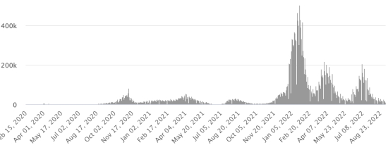 TOP 5 des Communes les plus touchées dans l’Ouest (2022) : Delmas : 1,227 (+16) ; Pétion-ville 1,096 (+21) ; Port-au-Prince 635 (+7) ; Tabarre 503 (+3) ; Croix-des-Bouquets 420 (+6) Cas confirmés par département (2022 / 2021 / 2020) : Ouest : 2022 : 4,332 (+) cas ; (2021 : 9,890) ; (2020 : 6,945 cas) Nord : 2022 : 390 (+) cas ; (2021 : 664) ; (2020 : 677 cas) Centre : 2022 : 398 (=) cas ; (2021 : 1,001) ; (2020 : 508 cas) Artibonite : 2022 : 386 (+) cas ; (2021 : 855) ; (2020 : 593 cas) Nord-Est : 2022 : 269 (=) cas ; (2021 : 404) ; (2020 : 314 cas) Sud-Est : 2022 : 383 (+) cas ; (2021 : 768) ; (2020 : 274 cas) Sud : 2022 : 324 (=) cas ; (2021 : 891) ; (2020 : 262 cas) Nord-Ouest : 2022 : 434 (+) cas ; (2021 : 383) ; (2020 : 229 cas) Grand'Anse : 2022 : 277 (+) cas ; (2021 : 861) ; (2020 : 176 cas) Nippes : 2022 : 133 (=) cas ; (2021 : 249) (2020 : 149 cas) Décès cumulés par département (2022-2021) : Ouest : 300 décès (2020 : 104 décès) Nord : 54 décès (2020 : 34 décès) Centre : 79 décès (2020 : 13 décès) Artibonite : 42 décès (2020 : 39 décès) Nord-Est : 7 décès (2020 : 6 décès) Sud : 51 décès (2020 : 6 décès) Sud-Est : 15 décès (2020 : 9 décès) Nord-Ouest : 16 décès (2020 : 12 décès) Grand'Anse : 7 décès (2020 : 13 décès) Nippes : 27 décès (2020 : 5 décès) Répartition des décès par âge (depuis le début de l’épidémie) : 0-9 ans : 15 décès 10-19 ans : 10 décès 20-29 ans : 32 décès 30-39 ans : 56 décès 40-49 ans : 81 décès 50-59 ans : 136 décès 60-69 ans : 188 décès 70-79 ans : 185 décès 80 ans et plus : 138 décès Vaccination : 254,833 haïtiens (2,19% de la population) +1,260 en 8 jours ont reçu une 1ère dose de vaccin depuis le 16 juillet 2021 date de la première injection à travers 149 centres de vaccinations ouverts et 167,428 haïtiens sont entièrement vaccinés (2 doses, 1,44% de la population) +1,418 en 8 jours. Mise à jour 25 août 2022 dernières informations disponibles (source MSPP). Liste des 149 Centres de vaccination ouverts en Haïti (et horaires) par département : (mise à jour 20 octobre 2021, dernières informations disponibles) DIASPORA : Situation épidémiologique : USA : *Cas depuis le premier cas (29 février 2020) : 96,643,172 cas (+16,835 en 24h), la veille (+9,832 en 24h) *Guérisons : 92,602,975 guérisons (+108,792 en 24h), la veille (+104,616 en 24h) Taux national de Guérison : 95,81% (+) *Décès : 1,072,978 (+32 cas en 24h), la veille (+16 en 24h) Taux de mortalité : 1,11% (=) *Cas actifs (moins décès et guérisons) : 2,967,219 cas (-91,989 en 24h), la veille (-94,800 en 24h) USA : Nombre de cas confirmés quotidiens :