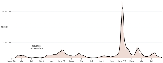 TOP 5 des Provinces ayant le plus de nouveaux cas les dernières 24h : Santiago : +79 nouveaux cas en 24h (-) Distrito Nacional : +73 nouveaux cas en 24h (-) Santo Domingo : +41 nouveaux cas en 24h (-) Espaillat : +27 nouveaux cas en 24h (-) La Vega : +14 nouveaux cas (-) Vaccination : 15,98 millions de doses de vaccin injectées depuis le 16 février 2021, date de la première injection en République Dominicaine (+10,000 doses). (Dernières données disponibles). QUÉBEC : Avertissement: Les autorités sanitaires du Québec ne mettent plus à jour les données sur la situation du Covid le weekend. Les chiffres ci-dessous sont donc les derniers disponibles. Notez que lundi 5 septembre étant un jour férié (Fête du Travail) ces données n’ont également pas été mises à jour. Cas confirmés depuis le premier cas (27 février 2020) : 1,179,550 cas (+761 en 24h), précédent (+946 en 24h) Décès : 16,409 décès (+23 en 24h) précédent (+12 en 24h) Taux de mortalité : 1,39% (=) Guérison : Le Centre d'expertise et de référence en santé publique ne rend plus disponible cette information. Québec : Nombre de cas confirmés quotidiens : (tendance 7 jours)
