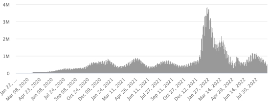 SITUATION MONDIALE 2019-2022 : Vendredi 9 septembre 2022 le nombre de personnes contaminées dans le monde par le coronavirus Covid-19 et ses variants depuis le début de la pandémie (11 mars 2020) s’élève à 612,748,971 cas (+632,663 en 24h), la veille (+578,706 en 24h) Nombre de pays contaminés : 228 *Guérisons : 590,680,157 personnes ont été guéries du Covid-19 dans le monde (+793,158 en 24h), la veille (+665,863 en 24h) *Décès : 6,512,825 personnes sont mortes du Covid-19 dans le monde depuis le début de la pandémie (+3,129 en 24h), la veille (+2,131 en 24h) *Cas actifs (moins décès et guérisons) dans le monde est actuellement de 15,555,989 cas (-163,624 en 24h), la veille (-89,288 en 24h) Taux de guérison au monde : 96,39% (+) Taux de mortalité au monde : 1,06% (=) Monde : Nombre de cas confirmés quotidiens :