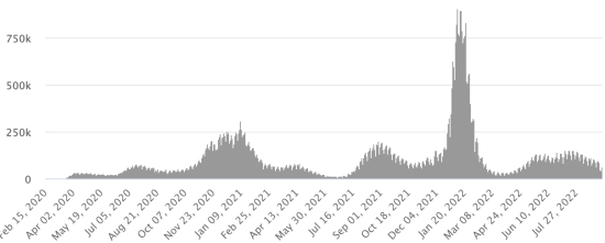 TOP 5 des Communes les plus touchées dans l’Ouest (2022) : Delmas : 1,234 (+7) ; Pétion-ville 1,106 (+10) ; Port-au-Prince 639 (+4) ; Tabarre 507 (+4) ; Croix-des-Bouquets 423 (+3) Cas confirmés par département (2022 / 2021 / 2020) : Ouest : 2022 : 4,363 (+) cas ; (2021 : 9,890) ; (2020 : 6,945 cas) Nord : 2022 : 392 (+) cas ; (2021 : 664) ; (2020 : 677 cas) Centre : 2022 : 403 (+) cas ; (2021 : 1,001) ; (2020 : 508 cas) Artibonite : 2022 : 389 (+) cas ; (2021 : 855) ; (2020 : 593 cas) Nord-Est : 2022 : 269 (=) cas ; (2021 : 404) ; (2020 : 314 cas) Sud-Est : 2022 : 384 (+) cas ; (2021 : 768) ; (2020 : 274 cas) Sud : 2022 : 329 (+) cas ; (2021 : 891) ; (2020 : 262 cas) Nord-Ouest : 2022 : 437 (+) cas ; (2021 : 383) ; (2020 : 229 cas) Grand'Anse : 2022 : 294 (+) cas ; (2021 : 861) ; (2020 : 176 cas) Nippes : 2022 : 134 (+) cas ; (2021 : 249) (2020 : 149 cas) Décès cumulés par département (2022-2021) : Ouest : 300 décès (2020 : 104 décès) Nord : 54 décès (2020 : 34 décès) Centre : 84 décès (2020 : 13 décès) Artibonite : 42 décès (2020 : 39 décès) Nord-Est : 7 décès (2020 : 6 décès) Sud : 51 décès (2020 : 6 décès) Sud-Est : 15 décès (2020 : 9 décès) Nord-Ouest : 16 décès (2020 : 12 décès) Grand'Anse : 7 décès (2020 : 13 décès) Nippes : 27 décès (2020 : 5 décès) Répartition des décès par âge (depuis le début de l’épidémie) : 0-9 ans : 15 décès 10-19 ans : 11 décès (+1) 20-29 ans : 33 décès (+1) 30-39 ans : 57 décès (+1) 40-49 ans : 81 décès 50-59 ans : 136 décès 60-69 ans : 188 décès 70-79 ans : 186 décès (+1) 80 ans et plus : 139 décès (+1) Vaccination : 254,833 haïtiens (2,19% de la population) +1,260 en 8 jours ont reçu une 1ère dose de vaccin depuis le 16 juillet 2021 date de la première injection à travers 149 centres de vaccinations ouverts et 167,428 haïtiens sont entièrement vaccinés (2 doses, 1,44% de la population) +1,418 en 8 jours. Mise à jour 25 août 2022 dernières informations disponibles (source MSPP). Liste des 149 Centres de vaccination ouverts en Haïti (et horaires) par département : (mise à jour 20 octobre 2021, dernières informations disponibles) DIASPORA : Situation épidémiologique : USA : *Cas depuis le premier cas (29 février 2020) : 96,959,165 cas (+88,787 en 24h), la veille (+153,805 en 24h) *Guérisons : 92,951,124 guérisons (+139,318 en 24h), la veille (+105,678 en 24h) Taux national de Guérison : 95,86% (+) *Décès : 1,074,787 (+616 cas en 24h), la veille (+876 en 24h) Taux de mortalité : 1,10% (=) *Cas actifs (moins décès et guérisons) : 2,933,254 cas (-51,147 en 24h), la veille (+47,251en 24h) USA : Nombre de cas confirmés quotidiens :