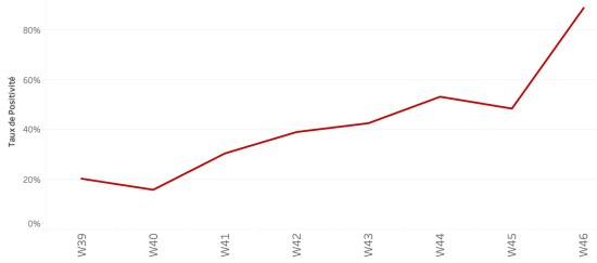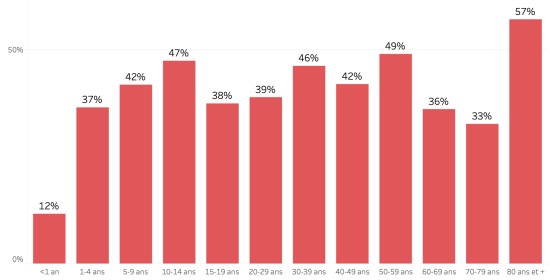 Répartition et écarts des cas suspects, total depuis le 3 octobre (en 24h) : Moins d’1 an : +200 (+12) 1-4 ans : 1,790 cas (+62) 5-9 ans : 1,303 cas (+36) 10-14 ans : 608 cas (+19) 15-19 ans : 451 cas (+23) 20-29 ans : 1,434 cas (+50) 30-39 ans : 1,435 cas (+45) 40-49 ans : 977 cas (+27) 50-59 ans : 649 cas (+13) 60-69 ans : 387 cas (+8) 70-79 ans : 189 cas (+11) 80 et + () cas () Hommes : 59,53% d’hommes (-) ; femmes 40,47% (+) Taux de positivité par segment d’âge :
