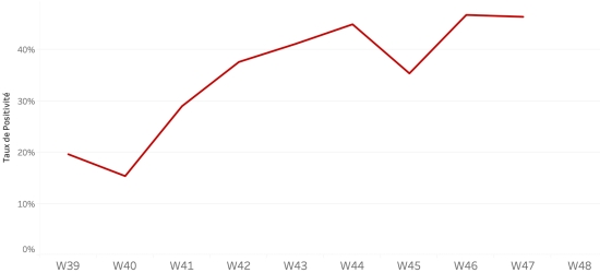 1er décembre 2022 : (dernières données disponibles) Données calculées depuis le premier cas confirmé (3 octobre 2022) Total des cas suspects : 12,826 cas +285 (+2,27%) en 24h (précédent : +15 en 24h ) Total des cas confirmés : 1,135 cas +25 (+2,25%) en 24h, (précédent : +28 en 24h) Total des cas suspects hospitalisés : 10,935 cas +344 (3,248%) en 24h, (précédent +7 en 24h) Total des décès : 272 décès (177 institutionnels et 95 communautaires) +39 décès (16,7%) en 24h, (précédent : +3 décès en 24h). Bilan partiel du choléra en Haïti selon les données de la Direction d’Épidémiologie, des Laboratoires et de la Recherche du Ministère de la Santé publique. Taux de positivité hebdomadaire :