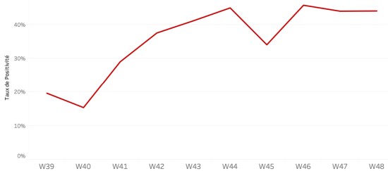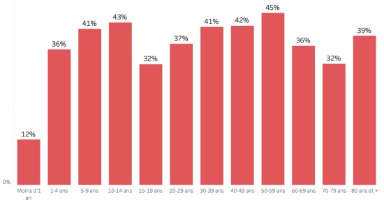 Répartition et écarts des cas suspects, total depuis le 3 octobre (en 24h) : Moins d’1 an : +275 (+3) 1-4 ans : 2,512 cas (+37) 5-9 ans : 1,820 cas (+21) 10-14 ans : 885 cas (+12) 15-19 ans : 669 cas (+13) 20-29 ans : 2,019 cas (+26) 30-39 ans : 1,991 cas (+44) 40-49 ans : 1,355 cas (+19) 50-59 ans : 892 cas (+16) 60-69 ans : 540 cas (+5) 70-79 ans : 268 cas (+5) 80 et + 23 cas (+0) Hommes : 58,40% d’hommes (+) ; Femmes 41,60% (-) Taux de positivité par segment d’âge :