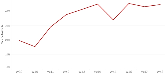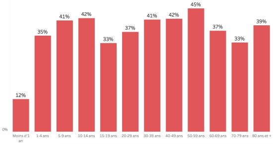 Répartition et écarts des cas suspects, total depuis le 3 octobre (en 24h) : Moins d’1 an : +277 (+2) 1-4 ans : 2,553 cas (+10) 5-9 ans : 1,849 cas (+9) 10-14 ans : 895 cas (+2) 15-19 ans : 685 cas (+6) 20-29 ans : 2,065 cas (+16) 30-39 ans : 2,034 cas (+25) 40-49 ans : 1,375 cas (+9) 50-59 ans : 909 cas (+5) 60-69 ans : 549 cas (+4) 70-79 ans : 269 cas (+0) 80 et + 23 cas (+0) Hommes : 58,53% d’hommes (+) ; Femmes 41,47% (-) Taux de positivité par segment d’âge :