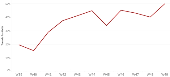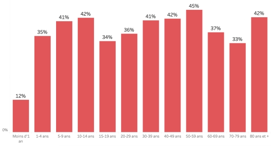 Répartition et écarts des cas suspects, total depuis le 3 octobre (en 24h) : Moins d’1 an : +293 (+0) 1-4 ans : 2,660 cas (+30) 5-9 ans : 1,931 cas (+20) 10-14 ans : 925 cas (+5) 15-19 ans : 712 cas (+4) 20-29 ans : 2,183 cas (+27) 30-39 ans : 2,102 cas (+17) 40-49 ans : 1,435 cas (+17) 50-59 ans : 958 cas (+15) 60-69 ans : 574 cas (+5) 70-79 ans : 284 cas (+4) 80 et + 26 cas (+1) Hommes : 58,56% d’hommes (-) ; Femmes 41,44% (+) Taux de positivité par segment d’âge :