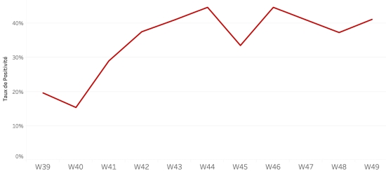 13 décembre 2022 : (dernières données disponibles) Données calculées depuis le premier cas confirmé (3 octobre 2022) Total des cas suspects : 15,129 cas +195 (+1,30%) en 24h (précédent : +157 en 24h ) Total des cas confirmés : 1,290 cas +13 (+1,01%) en 24h, (précédent : +10 en 24h) Total des cas suspects hospitalisés : 13,030 cas +140 (+1,08%) en 24h, (précédent +181 en 24h) Total des décès : 304 décès (201 institutionnels et 103 communautaires) +4 décès (1,33%) en 24h, (précédent : +9 décès en 24h). Bilan partiel du choléra en Haïti selon les données de la Direction d’Épidémiologie, des Laboratoires et de la Recherche du Ministère de la Santé publique. Taux de positivité hebdomadaire :