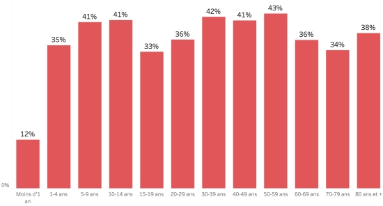Répartition et écarts des cas suspects, total depuis le 3 octobre (en 24h) : Moins d’1 an : +305 (+3) 1-4 ans : 2,810 cas (+22) 5-9 ans : 2044 cas (+19) 10-14 ans : 985 cas (+7) 15-19 ans : 760 cas (+7) 20-29 ans : 2,326 cas (+23) 30-39 ans : 2,238 cas (+19) 40-49 ans : 1,519 cas (+14) 50-59 ans : 1,018 cas (+9) 60-69 ans : 616cas (+7) 70-79 ans : 312 cas (+5) 80 et + 29 cas (+0) Hommes : 58,66% d’hommes (-) ; Femmes 41,34% (+) Taux de positivité par segment d’âge :