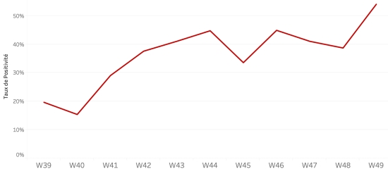15 décembre 2022 : (dernières données disponibles) Données calculées depuis le premier cas confirmé (3 octobre 2022) Total des cas suspects : 15,310* cas -90 (%) en 24h (précédent : +271 en 24h ) Total des cas confirmés : 1,310 cas +19 (+1,47%) en 24h, (précédent : +1 en 24h) Total des cas suspects hospitalisés : 13,161 cas +152 (+1,16%) en 24h, (précédent -21* en 24h) Total des décès : 305 décès (202 institutionnels et 103 communautaires) +0 décès (%) en 24h, (précédent : +1 décès en 24h). * Corrections du Ministère Bilan partiel du choléra en Haïti selon les données de la Direction d’Épidémiologie, des Laboratoires et de la Recherche du Ministère de la Santé publique. Taux de positivité hebdomadaire :