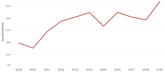 17 décembre 2022 : (dernières données disponibles) Données calculées depuis le premier cas confirmé (3 octobre 2022) Total des cas suspects : 17,140 cas +804 (+4,92%) en 24h (précédent : 1,026 en 24h ) Total des cas confirmés : 1,310 cas +0 (%) en 24h, (précédent : +0 en 24h) Total des cas suspects hospitalisés : 14,529 cas +389 (+2,75%) en 24h, (précédent +979 en 24h) Total des décès : 311 décès (207 institutionnels et 104 communautaires) +3 décès (+0,97%) en 24h, (précédent : +3 décès en 24h). Bilan partiel du choléra en Haïti selon les données de la Direction d’Épidémiologie, des Laboratoires et de la Recherche du Ministère de la Santé publique Taux de positivité hebdomadaire :