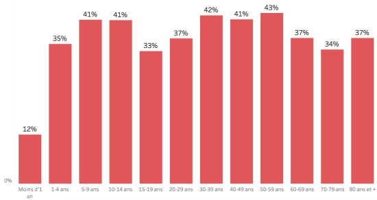 Répartition et écarts des cas suspects, total depuis le 3 octobre (en 24h) : Moins d’1 an : +309 (-3)* 1-4 ans : 3,228 cas (+250) 5-9 ans : 2,350 cas (+127) 10-14 ans : 1,152 cas (+60) 15-19 ans : 858 cas (+34) 20-29 ans : 2,539 cas (+61) 30-39 ans : 2,426 cas (+36) 40-49 ans : 1,645 cas (+36) 50-59 ans : 1,148 cas (+36) 60-69 ans : 708 cas (+31) 70-79 ans : 372 cas (+21) 80 et + 29 cas (+0) *Correction du Ministère Hommes : 58,33% d’hommes (-) ; Femmes 41,67% (+) Taux de positivité par segment d’âge :