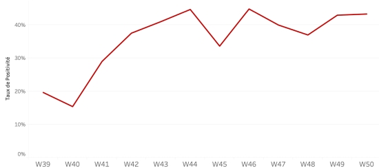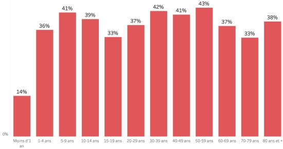 Répartition et écarts des cas suspects, total depuis le 3 octobre (en 24h) : Moins d’1 an : +326 (+8) 1-4 ans : 3,433 cas (+86) 5-9 ans : 2,517 cas (+81) 10-14 ans : 1,231 cas (+32) 15-19 ans : 910 cas (+18) 20-29 ans : 2,676 cas (+54) 30-39 ans : 2,558 cas (+53) 40-49 ans : 1,729 cas (+36) 50-59 ans : 1,217cas (+30) 60-69 ans : 760 cas (+23) 70-79 ans : 390 cas (+10) 80 et + 31 cas (+0) Hommes : 58,16% d’hommes (-) ; Femmes 41,84% (+) Taux de positivité par segment d’âge :