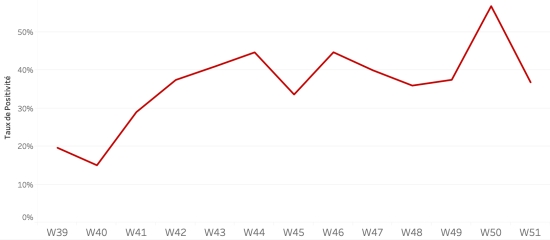 25 décembre 2022 : (dernières données disponibles) Données calculées depuis le premier cas confirmé (3 octobre 2022) Total des cas suspects : 19,592 cas +116 (0,59%) en 24h (précédent : +98 en 24h ) Total des cas confirmés : 1,427** cas inchangé (1,42%) en 24h, (précédent : +20 en 24h) Total des cas suspects hospitalisés : 16,768 cas +79 (+0,47%) en 24h, (précédent +108 en 24h) Total des décès : 363 décès (242 institutionnels et 121 communautaires) +1 décès (%) en 24h, (précédent : +7 décès en 24h). **Aucun test réalisé depuis 2 jours Bilan partiel du choléra en Haïti selon les données de la Direction d’Épidémiologie, des Laboratoires et de la Recherche du Ministère de la Santé publique Taux de positivité hebdomadaire :