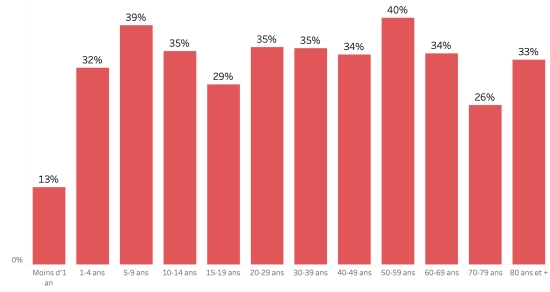 18 avril 2023 : (dernières données disponibles, précédent bulletin du Ministère 17 avril 2023 https://www.haitilibre.com/article-39388-haiti-cholera-bulletin-quotidien-161.html Données calculées depuis le premier cas confirmé (3 octobre 2022) Total des cas suspects : 40,567 cas +149 en 24h, la veille +139 en 24h Total des cas confirmés : 2,672 cas +1, la veille +2 en 24h Total des cas hospitalisés (suspects et confirmés) : 35,078 cas +143 en 24h, la veille +156 en 24h Total des décès : 670• décès ((448 institutionnels (+0) et 222 communautaires (+0)) +0, la veille +0 * Information non mise à jour depuis 2 jours Bilan partiel du choléra en Haïti selon les données de la Direction d’Épidémiologie, des Laboratoires et de la Recherche du Ministère de la Santé publique et de la Population (MSPP). Répartition et écarts des cas suspects, total depuis le 3 octobre : Moins d’1 an : + 933 (+3) 1-4 ans : 8,263 cas (+23) 5-9 ans : 5,899 cas (+16) 10-14 ans : 2,934 cas (+13) 15-19 ans : 2,125 cas (+6) 20-29 ans : 5,300 cas (+30) 30-39 ans : 4,549 cas (+15) 40-49 ans : 3,342 cas (+17) 50-59 ans : 2,539 cas (+14) 60-69 ans : 1,783 cas (+7) 70-79 ans : 1,020 cas (+5) 80 ans et + : 98 cas cas (Le MSPP ne met plus à jour cette donnée) Hommes : 54,80% d’hommes (=) ; Femmes 45,19 (=) Taux de positivité par segment d’âge :