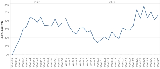 Nombre de tests réalisés : 9,670 +0* en 24h, précédent +59 en 48h *Non actualisé par le Laboratoire National ces dernières 24h Taux de positivité : 35,69%, précédent 35,69% Évolution hebdomadaire du taux de positivité (semaine 27) :