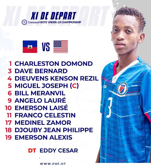 Vendredi 11 août 2023 en 1/2 finale du Championnat masculin U-15 de la Confédération de l'Amérique du Nord, de l'Amérique Centrale et des Caraïbes (CONCACAF) nos jeunes Grenadiers (ligue A), affrontaient les « Yanks » des États-Unis sur la pelouse du Stade Olympique Felix Sanchez, à Santo Domingo en République Dominicaine Ce match pour Haïti avait un goût de revanche après la défaites [3-0] contre le États-Unis sur le terrain détrempé de du Stade panaméricain de San Cristóbal en République Dominicaine https://www.haitilibre.com/article-40211-haiti-flash-humilie-par-les-usa-[3-0]-haiti-reste-qualifie-pour-les-1-4-de-finale.html Malgré tous leurs efforts nos petits grenadiers qui ont rendu la vie difficile aux américains se sont inclinés en demi final [1-0] devant les « Yanks » qui se sont qualifié de justesse pour la finale. Face à Haïti pour la deuxième fois dans cette compétition https://www.haitilibre.com/article-40211-haiti-flash-humilie-par-les-usa-[3-0]-haiti-reste-qualifie-pour-les-1-4-de-finale.html les États-Unis ont traversé une première mi-temps difficile face à nos vaillants grenadiers. Au terme de la première période est resté nul [0-0] Au retour des vestiaires, un but sur coup franc en début de période sur une tête de Sebastian Chavez a ouvert le score en faveur des États-Unis [0-1]. Malgré les efforts de nos Grenadiers et quelques occasions non concrétisées, Haïti n’a pas été en mesure de trouver l’égalité en raison d’une solide défense américaine qui a pu tenir Haïti à distance. Au terme du match les États-Unis se sont qualifié a minima de justesse pour la finale du Championnat [1-0] face a un de leur adversaire des plus dangereux. Nos Grenadiers qui n’ont pas démérité, joueront dimanche 13 août le match de classement contre la Jamaïque. (qui a perdu 3-0 contre le Mexique) 11 de départ : Pour cette rencontre face aux États-Unis en demi-finale, l’entraîneur Eddy César a reconduit les mêmes joueurs qui ont remporté la victoire face au Canada [1-0] https://www.haitilibre.com/article-40227-haiti-flash-nos-grenadiers-vainqueurs-du-canada-[1-0]-sont-qualifies-pour-la-demi-finale.html