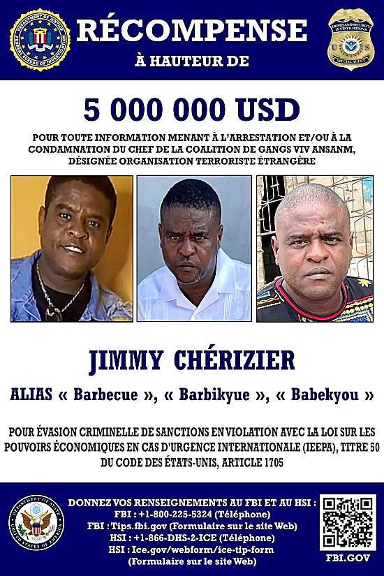 L’offre de récompense d’aujourd’hui est autorisée par le secrétaire d’État dans le cadre du Transnational Organized Crime Rewards Program (TOCRP), qui soutient les efforts des forces de l’ordre visant à lutter contre la criminalité transnationale à l’échelle mondiale et à traduire les fugitifs en justice. Si vous disposez d’informations, veuillez contacter le FBI au 1-800-CALL-FBI ou en ligne à l’adresse https://tips.fbi.gov/home . Les informations peuvent également être communiquées à HSI au 1-866-DHS-2-ICE ou en ligne à l’adresse www.ice.gov/webform/ice-tip-form . Si vous vous trouvez en dehors des États-Unis, vous pouvez également vous rendre à l’ambassade ou au consulat américain le plus proche. Si vous êtes aux États-Unis, vous pouvez également contacter le bureau local du FBI de votre ville. Toutes les identités sont gardées strictement confidentielles. Les fonctionnaires et employés du Gouvernement ne sont pas éligibles pour les récompenses. Téléchargez avis de recherche en Français en PDF : https://www.haitilibre.com/docs/avis-recherche-wanted-jimmy-cherizier-5-millions-fr.pdf Téléchargez avis de recherche en anglais en PDF : https://www.haitilibre.com/docs/avis-recherche-wanted-jimmy-cherizier-5-millions-en.pdf Téléchargez avis de recherche en Créole en PDF : https://www.haitilibre.com/docs/avis-recherche-wanted-jimmy-cherizier-5-millions-kr.pdf Lire aussi : SL/ HaïtiLibre