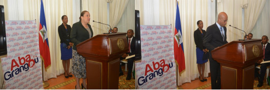 Le Président Michel Joseph Martelly et la Première Dame de la République, Sophia Martelly ont officiellement lancé, mardi 24 janvier 2012, au Palais National, le Programme National de Lutte contre la Faim et la Malnutrition : « Aba Grangou ». Dès cette année, 10,000 agents de développement seront mobilisés sur tout le territoire pour accompagner chacun, 100 familles. La cérémonie s’est déroulée en présence des personnalités et institutions nationales et internationales concernées par ce programme qui vise la création des conditions nécessaires à la réalisation d’une alimentation saine pour tous les Haïtiens, l’implantation d’actions concrètes d’urgence et de long terme visant à briser le cercle vicieux de la faim et de la malnutrition, d’ici à 2025.